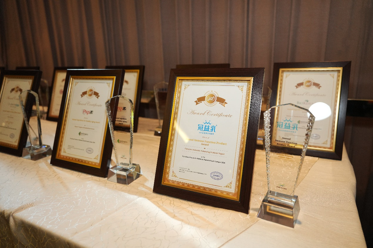 为了表彰在功能食品领域取得优秀成绩的企业和产品,组委会在峰会第一天晚上的颁奖典礼上,给7家企业颁发了16个奖杯和证书。