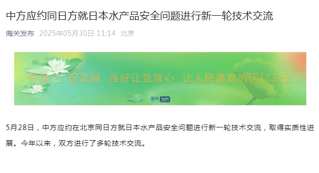 中新网5月30日电 据“海关发布”微信公众号消息,5月28日,中方应约在北京同日方就日本水产品安全问题进行新一轮技术交流,取得实质性进展。今年以来,双方进行了多轮技术交流。