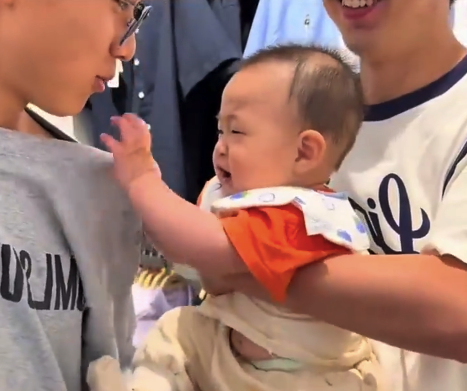 爸爸怀里的宝宝撒娇要舅舅抱 网友:舅舅也是专业人士了