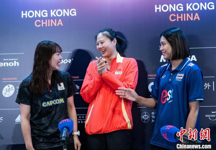 图为保加利亚队队员拉多斯蒂娜·马里诺娃(左)、意大利队队员萨拉·法尔(中)和泰国队队员阿耶查拉蓬·孔育在发布会上会心交流。中新网记者 侯宇 摄
