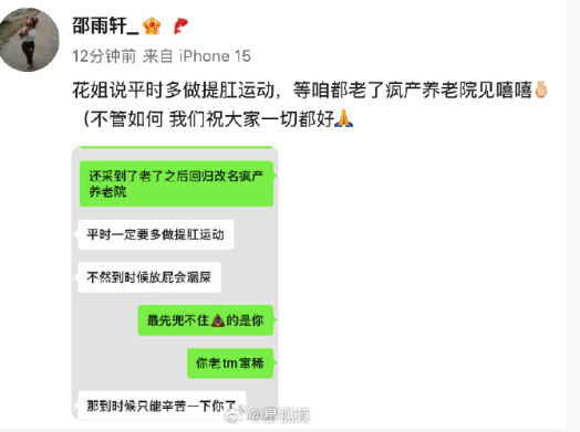 6月19日,邵雨轩谈疯产姐妹解散原因登上热搜,其在采访中透露疯产姐妹解散的真实原因:巨大的流量像沉重的行囊,越想给别人快乐,自己越不快乐。19日下午,邵雨轩发文:花姐说平时多做提肛运动,等咱都老了疯产养老院见嘻嘻。