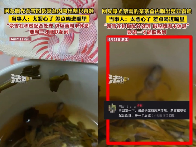 近日,一名网友称,冲泡奈雪的茶“茉莉花茶”茶包时,发现杯中漂浮整只青蛙干尸。指出干蛙与白色茉莉花外观相似,冲泡时难以分辨。奈雪的茶方面称,公司高度重视此事,已和消费者协商处理完毕。