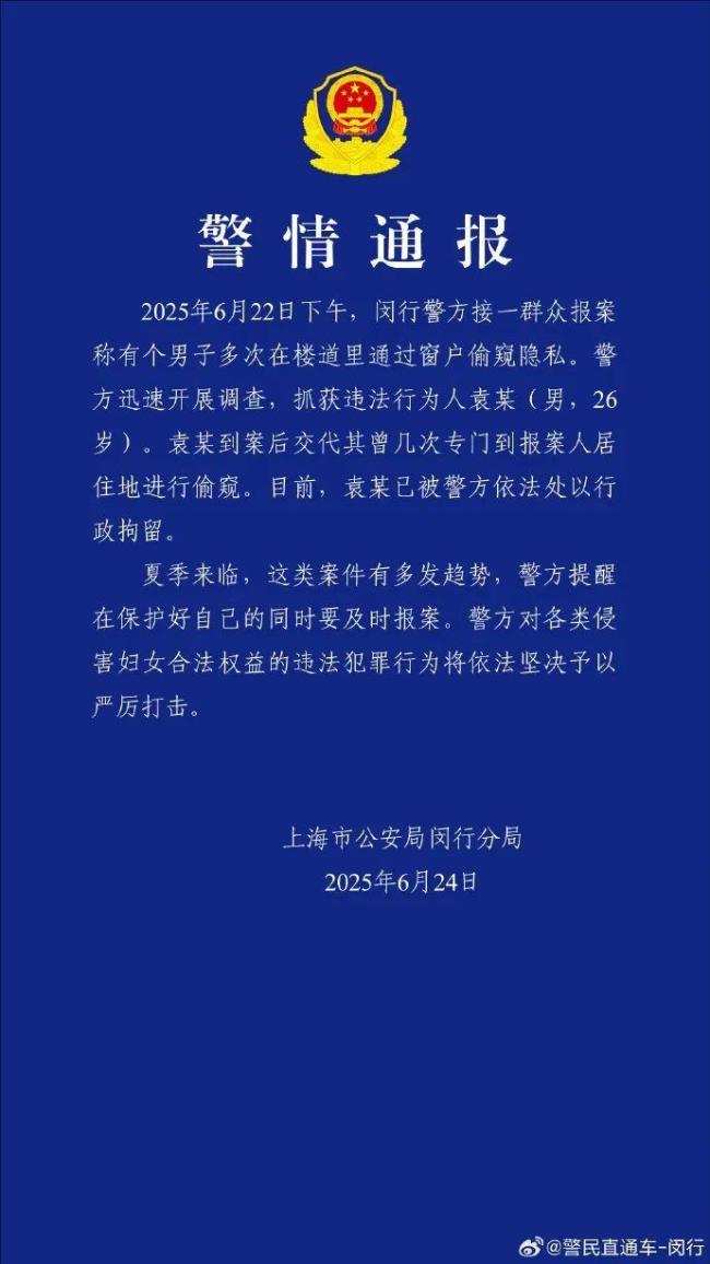 6月24日,上海市公安局闵行分局官方微博发布了一则警情通报。6月22日下午,闵行警方接到一名群众报案,称有一名男子多次在楼道里通过窗户偷窥隐私。警方迅速展开调查,并抓获了违法行为人袁某(男,26岁)。袁某承认他曾几次专门到报案人居住地进行偷窥。目前,袁某已被依法处以行政拘留。