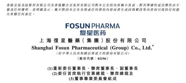 4月29日,复星医药发布公告称,因工作安排调整,吴以芳、王可心分别辞去董事长、联席董事长职务;选举陈玉卿担任第九届董事会董事长、关晓晖担任第九届董事会联席董事长、文德镛担任第九届董事会副董事长。