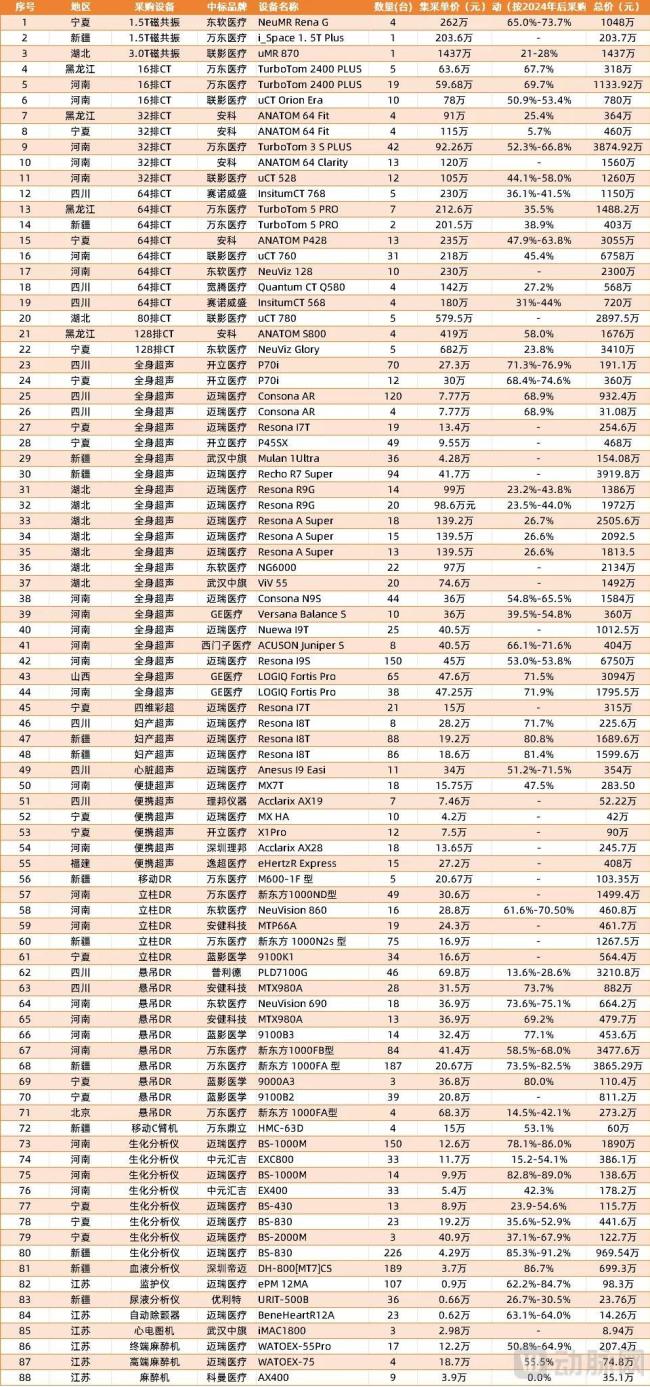 部分县域医共体设备更新集采设备跌幅测算数据来源:宁夏、新疆、河南、北京、四川、江苏、湖北、黑龙江8个省市公开招投标数据(价格变动参考2024年后公开招投标价格,未考虑减配影响;部分未公开采购设备型号没有列入表格,可能存在一定误差)
