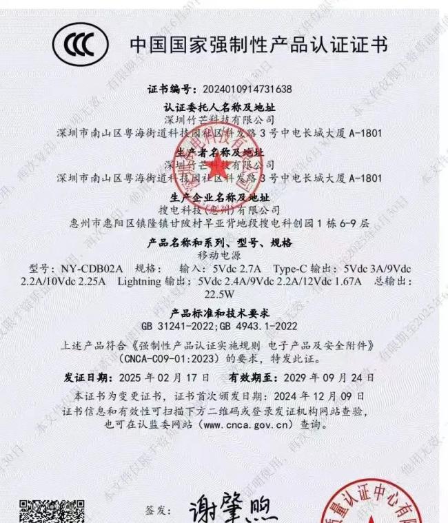 随后对方发来一份3C证书,证书显示,生产者为深圳竹芒科技有限公司,生产企业为搜电科技(惠州)有限公司。发证日期为2025年2月17日,有效期至2029年9月24日。