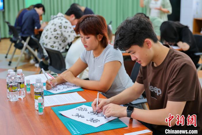 7月6日,海外华裔大学生走进海南大学,现场体验黎锦传统图案刻纸。中新网记者 骆云飞 摄