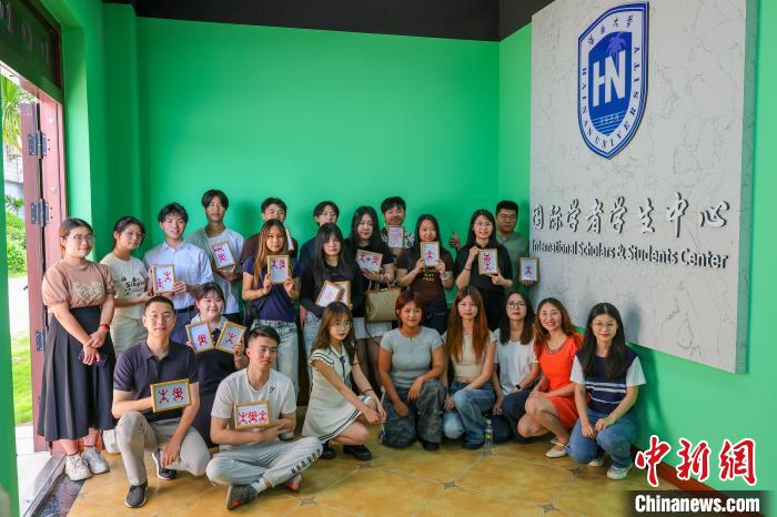 7月6日,海外华裔大学生走进海南大学,现场体验黎锦传统图案刻纸。图为活动后合影。中新网记者 骆云飞 摄
