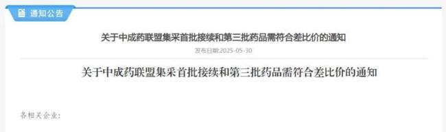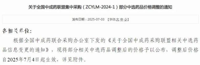 7月3日,上海阳光医药采购网发布《关于全国中成药联盟集中采购(ZCYLM-2024-1)部分中选药品价格调整的通知》,公布部分相关中选药品调整后的价格,并明确自2025年7月4日起生效。