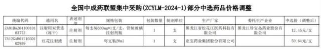 具体来看,此次调整涉及第三批全国中成药集采两家中选药企的两个药品。其中,黑龙江省松花江医药科技有限公司(以下简称“黑龙江省松花江医药”)生产的注射用双黄连(冻干,规格为每支装600mg)中选价从原本的19.7元/支降到12.45元/支,降幅超过36%;亚宝药业集团股份有限公司(以下简称“亚宝药业”)生产的红花注射液(规格为每支装20ml)中选价从74.98元/支降到50.64元/支,降幅也超过32%。