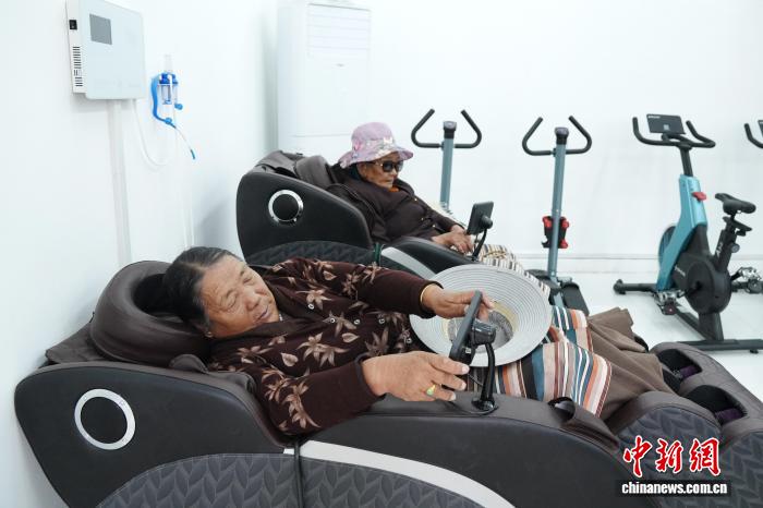 在活动室,78岁的白玛躺在按摩椅中享受按摩服务。她告诉记者,儿子平日在外上班,她的一日三餐都在驿站。娱乐休闲之余,她对按摩椅很感兴趣,每天都用1个小时疏通筋骨。和记者交流时一次按摩结束,白玛熟练地在操作屏上再次按下启动按钮。