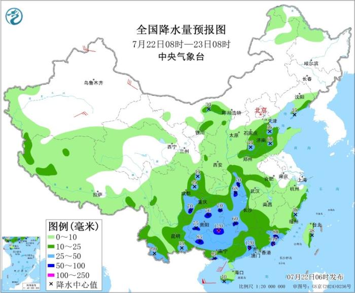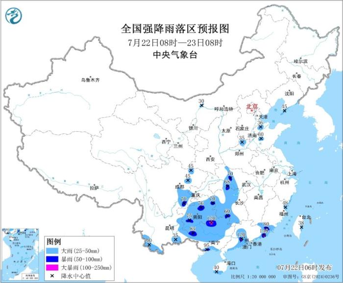 预计,7月22日08时至23日08时,海南岛南部、广东中南部、香港、澳门、福建东南部、台湾岛东部、广西大部、云南东部和南部、贵州、湖南中西部、湖北西部、重庆南部、四川盆地中部和南部以及山东中西部、河南北部、内蒙古河套地区等地的部分地区有大到暴雨,其中,广东南部、广西北部、贵州南部等地的局部地区有大暴雨(100~140毫米)。上述部分地区伴有短时强降水(最大小时降雨量20~50毫米,局地可超过70毫米),局地有雷暴大风等强对流天气(见图2)。中央气象台7月22日06时发布暴雨蓝色预警。
