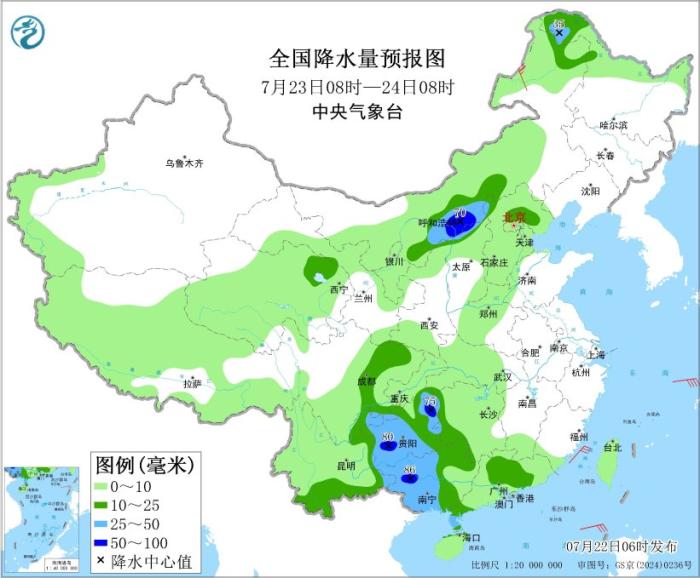 7月23日08时至24日08时,内蒙古河套地区和中部、黑龙江西北部、重庆东南部、贵州、广西中西部、云南东部等地的部分地区有大到暴雨(50~86毫米)(见图4)。