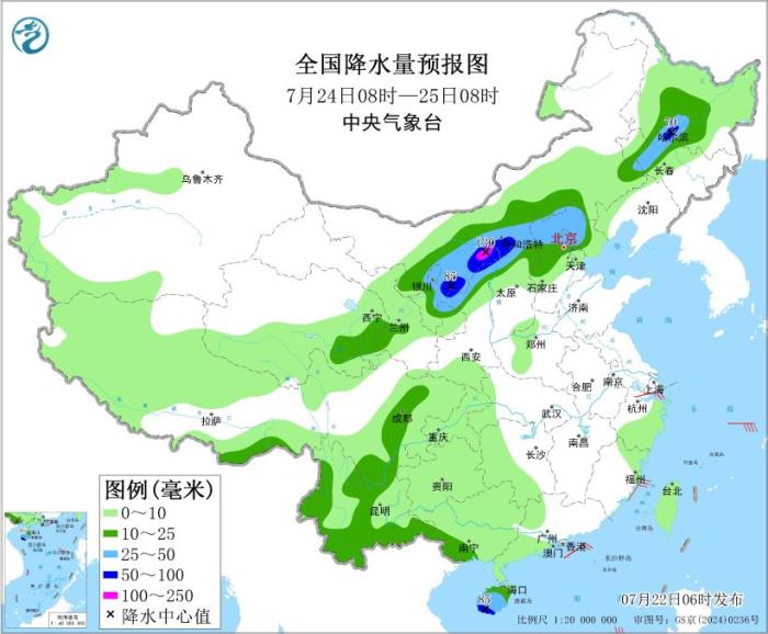 图5 全国降水量预报图(7月24日08时-25日08时)。 图片来源:中央气象台网站
