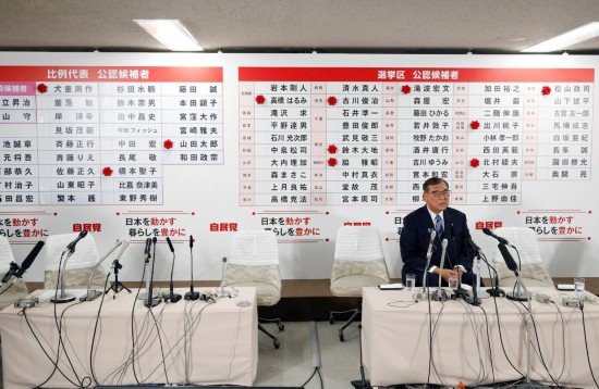7月20日,在日本东京自民党总部,石破茂回答记者提问。新华社发(Pool图片,弗兰克·罗比雄摄)