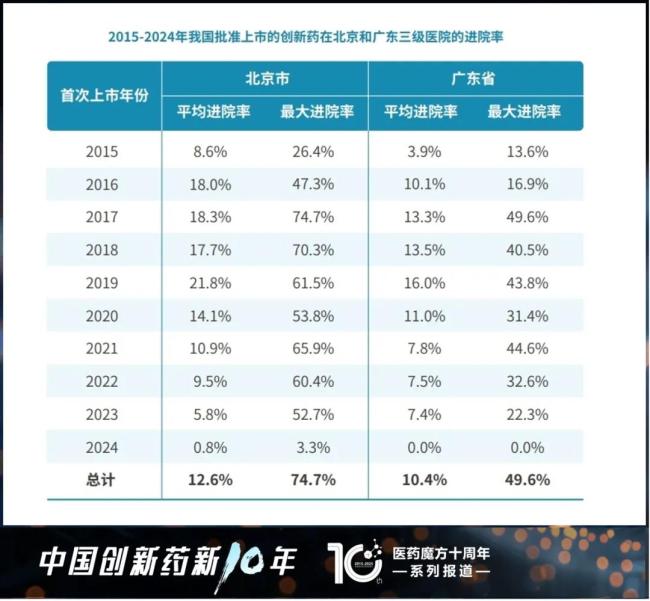 据医药魔方统计,以北京市和广东省为例,2015-2024年我国批准上市的创新药中,进入北京和广东地区三级医院用药目录的药品分别占50.6%和49.1%,即大约一半的创新药因未进入三级医院用药目录而无法买到;即便是已进入目录的创新药,平均进院率也仅为12.6%和10.4%,患者只能在很有限的医院内买到。