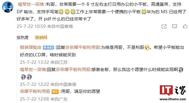 从评论区的讨论来看,荣耀小平板将提供12GB+256GB规格,并且会有5G通信版本。目前荣耀官方尚未公布更多详细信息。