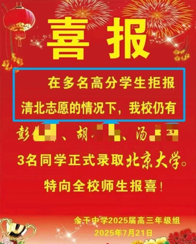 7月21日晚,有网友晒出江西上饶余干中学的一张高考喜报,引发关注。喜报上提到,在多名高分学生拒报清北志愿的情况下,该校仍有彭某某、胡某某、汤某某3名同学被北京大学正式录取。