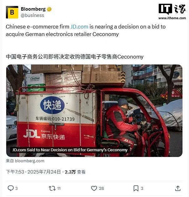 京东集团正考虑以22亿欧元收购德国电商公司Ceconomy。当地时间周四,Ceconomy确认正在与京东集团就潜在收购事宜进行深入谈判,收购报价为每股4.6欧元。据彭博社报道,京东即将就是否收购Ceconomy做出决定。若交易达成,其估值约为22亿欧元。