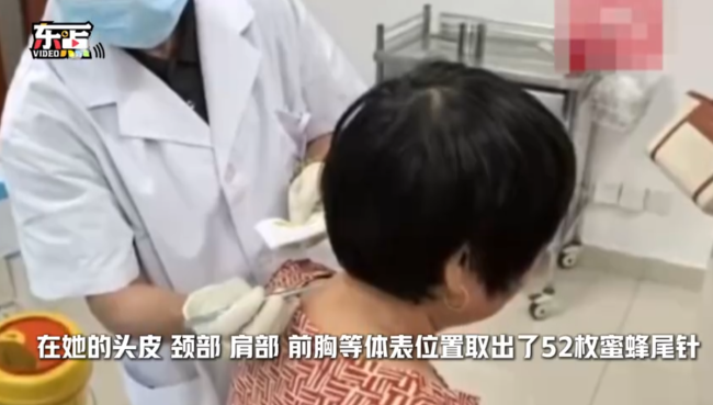 泰州市中医院急诊外科副主任宋宗民为邹大妈进行了检查,在她的头皮、颈部、肩部和前胸等部位取出了52枚蜜蜂尾针。邹大妈看到这些尾针后非常震惊,意识到如果再晚些就医,后果可能不堪设想。