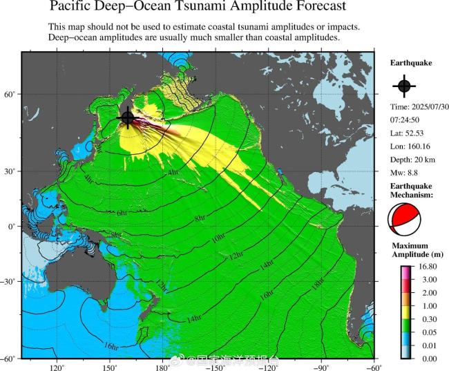 根据全球海啸监测数据,截至当天10时30分(北京时间),震源附近的海啸浮标已经监测到90厘米的海啸波,日本和俄罗斯沿岸分别观测到30到50厘米的海啸波。综合分析显示,海啸波将于13:30到达台湾沿岸,17-19点左右到达浙江和上海沿岸,最大波幅分别为60、40和30厘米。此外,台风“竹节草”正在浙江省境内移动,预计将在浙江和上海等沿海地区引发约100厘米的风暴增水。海啸与台风双重灾害影响下,沿海地区需高度警惕并做好防灾减灾工作。