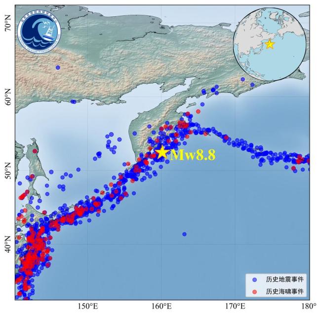 此次地震发生在太平洋板块与北美板块边界附近,属于典型的浅层逆断层构造运动。该区域历来是中强至大震频发地带。本次震中位于1952年堪察加半岛9.0级大地震震中东南方向45公里处,那次地震曾引发破坏性的环太平洋海啸。历史数据显示,过去100年间,在震源附近500千米范围内,曾发生过22次7.0级以上地震事件,最大的是1952年11月4日发生的9.0级地震。历史上该区域还发生过33次海啸事件,其中1952年的9.0级地震引发的海啸灾害在环太平洋区域造成约10000人死亡,最大海啸爬高18.4米。