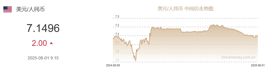 中新网8月1日电 据中国外汇交易中心网站消息,中国人民银行授权中国外汇交易中心公布,2025年8月1日银行间外汇市场人民币汇率中间价为:1美元对人民币7.1496元,下调2个基点。