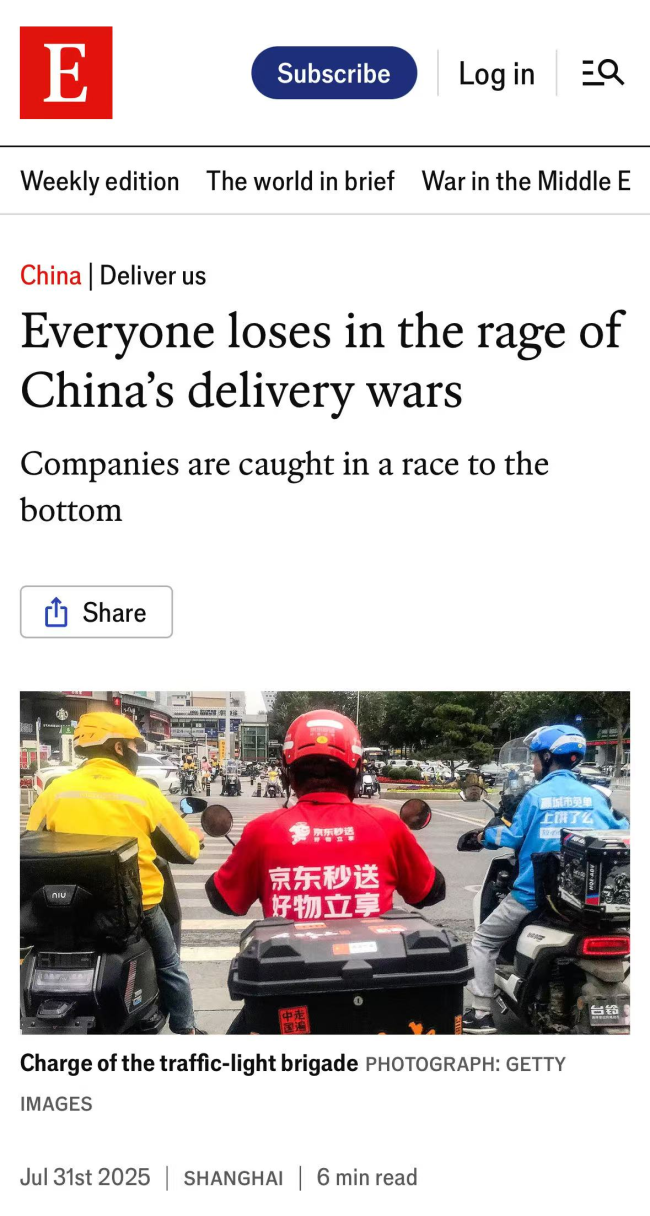 7月31日,英国知名媒体《经济学人》发表评论文章,认为中国“外卖大战”没有赢家,无论是商家、骑手,还是消费者、平台,都在为外卖大战的“内卷式”竞争付出代价。