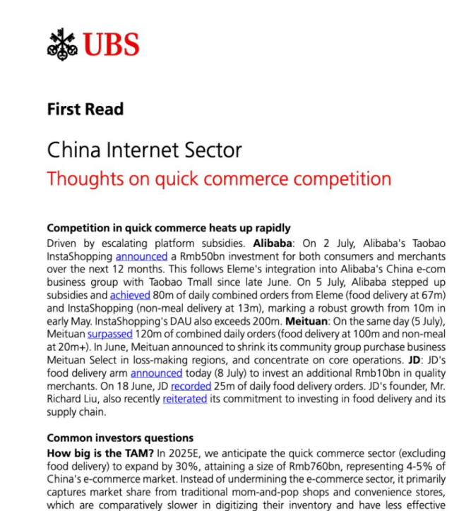 瑞银认为,外卖补贴过度引发了系列负面效应,其潜在的利润和价值明显不值得如此规模商战。头部互联网企业应将资源投向具有更大增长潜力的市场,比如国际市场或AI领域,而非在即时零售领域消耗资本。