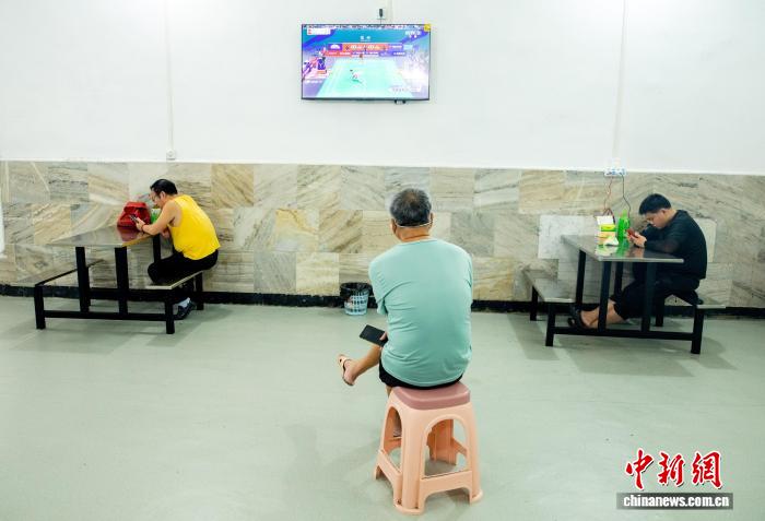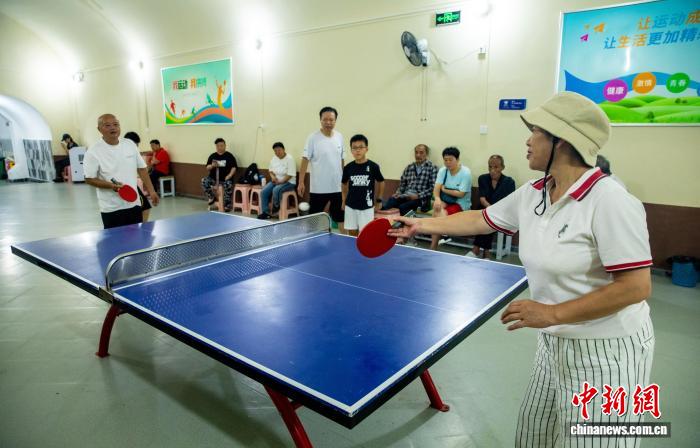 8月5日,在武昌蛇山人防工程纳凉点,市民在打乒乓球。中新社记者 张畅 摄