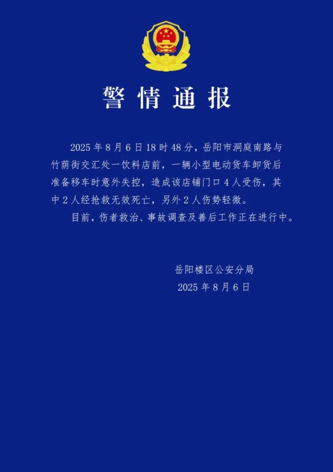 8月6日18时48分,岳阳市洞庭南路与竹荫街交汇处一饮料店前发生一起事故。一辆小型电动货车卸货后准备移车时意外失控,导致该店铺门口四人受伤,其中两人经抢救无效死亡,另外两人伤势轻微。