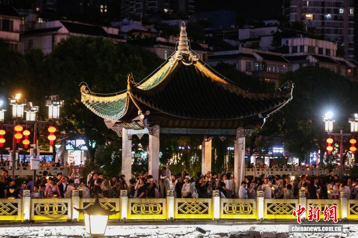 图为游客在甲秀楼景区打卡拍照。中新社记者 瞿宏伦 摄