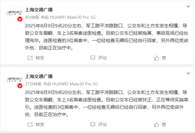 上海公交车与土方车碰撞侧翻 3名乘客送医检查!8月9日9点20分左右,杨浦区平凉路军工路口发生一起公交车与土方车碰撞事故,导致一辆公交车侧翻。交警、消防和牵引等部门迅速到达现场进行处置及施救。