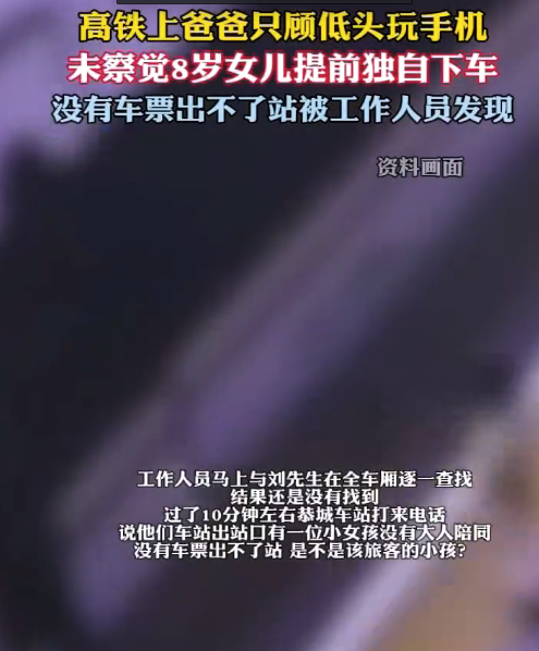 近日,D1832次列车从恭城站开车后不久,旅客刘先生急忙找到列车长项明,称自己8岁的女儿不见了,恭城到站前都还在座位上玩。接到旅客求助后,项明马上与恭城站取得联系,车站回复站台上没有小孩。项明马上与刘先生在全车厢逐一查找,结果还是没有找到。过了10分钟左右,恭城车站打来电话,说他们车站出站口有一位小女孩没有大人陪同,没有车票出不了站,是不是该旅客的小孩?后来恭城车站值班员发来视频,刘先生确认是其女儿。原来,列车到达恭城站时。刘先生只顾在列车上低头玩手机,未察觉女儿独自下车。
