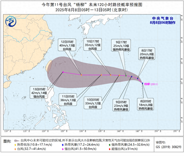 今年第11号台风“杨柳”于8月8日在西北太平洋洋面上生成。当天5点,其中心位于台湾省花莲市偏东方约2550公里的洋面上,北纬19.5度、东经145.9度,中心附近最大风力8级(18米/秒),中心最低气压1000百帕,七级风圈半径为120至220公里。