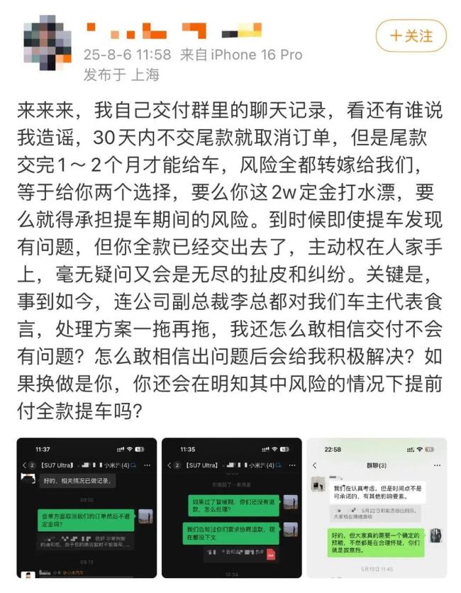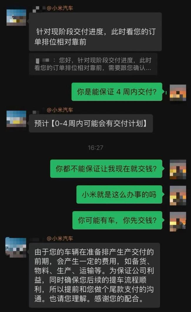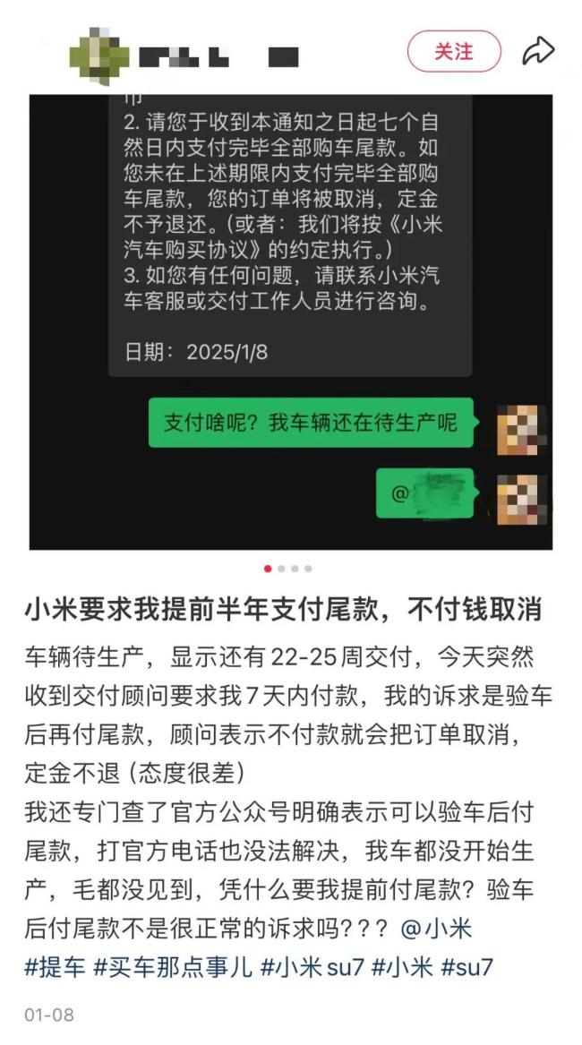 实际上不仅仅在小米SU7Ultra版,在去年年底,就有多位网友发帖吐槽小米汽车强制要求提前付尾款一事,有些车辆甚至尚未进入生产序列,用户就被要求尾款到位。“你都不能保证(4周内交付),让我现在交钱,小米就是这么办事的吗?”一位准车主面对销售顾问先付尾款的要求提出质疑。