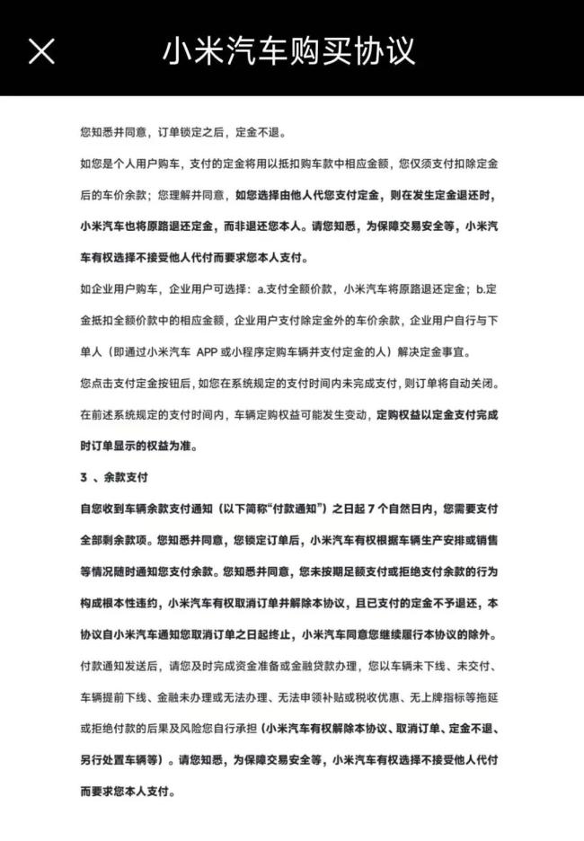 车没造就强制收尾款,否则定金不退,小米汽车被质疑霸王条款