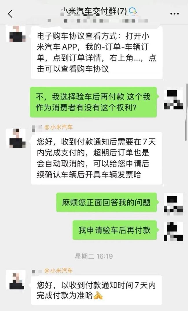 当然,也有许多小米车主表示,自己是验车后才支付的尾款。还有车主分享“被催款”经验,表示自己也被交付顾问要求验车前付款,随后该车主与销售顾问沟通却被告知“不用管”,最后该车主便没有管交付顾问提前付款的要求,而是在验车后才付的尾款。