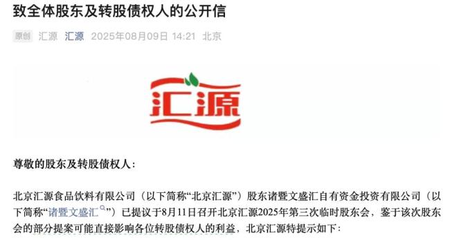 公开信背后,是因为诸暨文盛汇提议在今天(8月11日)召开2025年第三次临时股东会,并提案通过资本公积补亏方案。北京汇源鉴于鉴于该次股东会的部分提案可能直接影响各位转股债权人的利益,所以通过官方微信公众号刊发《致全体股东及转股债权人的公开信》(下称“公开信”)[1],称该提案可能导致不公平分红,甚至动摇汇源品牌“重生”基础。