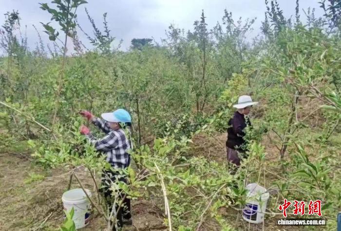 三三两两的村民穿梭田间,熟练地采摘连翘。王新楠 摄