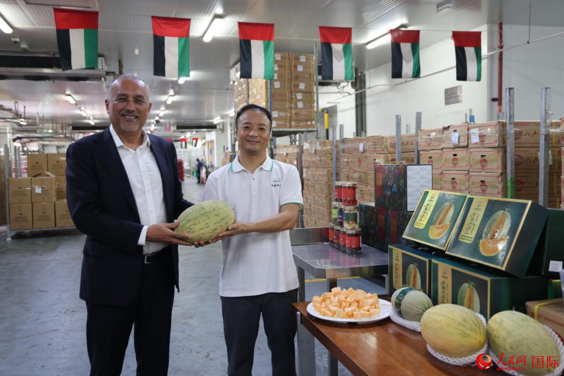 在位于迪拜的物流冷库,阿联酋中国新疆商会会长阿不来提(左)与新疆果业代表共同展示此次运抵的蜜瓜产品。人民网记者 张志文摄