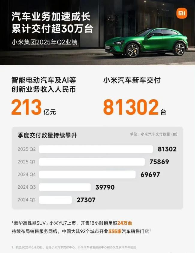 对于汽车业务的表现,小米解释称,汽车相关业务增长主要是由于汽车交付量及ASP(平均售价)增加所致——汽车交付量由去年同期的27307辆增加197.7%,至今年二季度的81302辆,产能相应提升。智能电动汽车的ASP由去年同期的每辆228644元上升10.9%,至今年二季度的每辆253662元,主要是由于交付ASP较高的Xiaomi SU7 Ultra所致。今年6月,小米发布了首款SUV车型YU7,定价25.35万元至32.99万元,开售18小时锁单量破24万台。