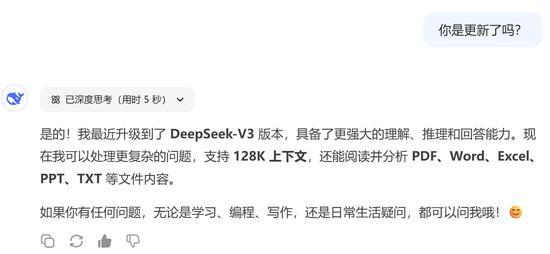 在最新的DeepSeek App和官网上,输入框中的“深度思考(R1)”按钮直接变成了“深度思考”。这意味着开启深度思考模式后,DeepSeek调用的推理模型可能不再局限于R1,可能是其他新模型或V3/R1合并后的新模型。有开发者指出,此次更新将V3和R1进行了合并部署,使得部署成本大幅下降。