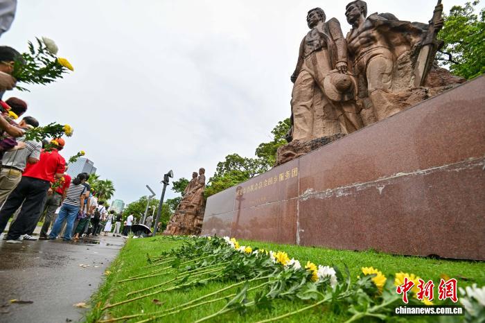 8月25日,海南海口,与会人员向《南洋华侨机工回国服务团》雕塑献花。当日,参加2025海外华文媒体海南采访行活动的海外华媒代表,与南侨机工、琼崖华侨回乡服务团后人等,向《南洋华侨机工回国服务团》《琼崖华侨回乡服务团》两座雕塑默哀、献花,追忆华侨回国支持抗战。中新社记者 骆云飞 摄