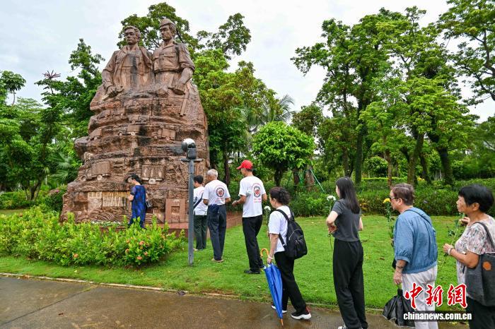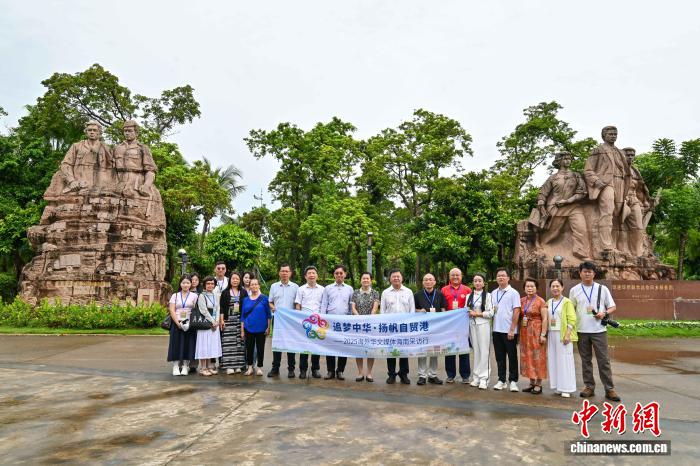 8月25日,海南海口,海外华文媒体代表在雕塑前合影。当日,参加2025海外华文媒体海南采访行活动的海外华媒代表,与南侨机工、琼崖华侨回乡服务团后人等,向《南洋华侨机工回国服务团》《琼崖华侨回乡服务团》两座雕塑默哀、献花,追忆华侨回国支持抗战。中新社记者 骆云飞 摄
