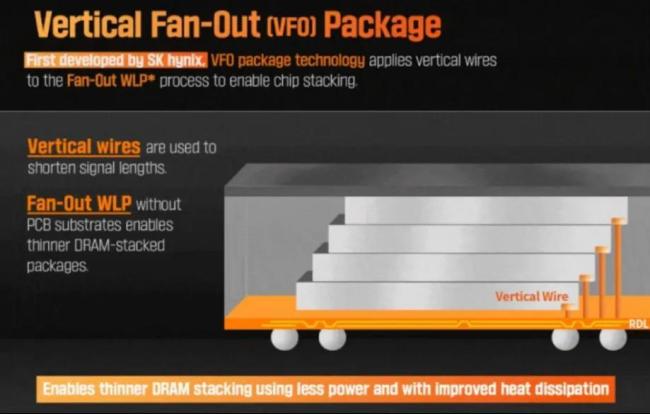 SK海力士正在开发的“VFO”技术中,DRAM同样以阶梯式方式堆叠,不过与三星在工艺上有所不同,并且用铜线替代了三星的铜柱。