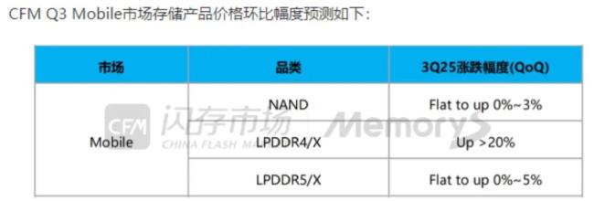 CFM预测Q3 Mobile市场存储产品价格将环比提升,其中原厂Mobile NAND ASP以持平至低个位数上涨为主,LPDDR4X环比大幅上涨20%以上,LPDDR5X预计将出现中低个位数小幅上涨。