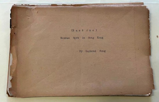 这是一本普通信纸大小、纸张泛黄发黑的笔记,封面用红字写着《东江纵队与盟军》。这份档案未经装订,只用别针夹着,页边已脆化。