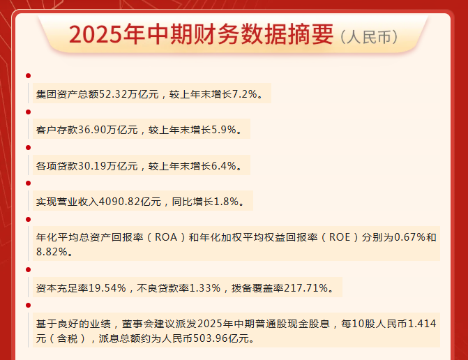 2025年8月29日,中国工商银行(股票代码SH:601398;HK:1398)公布2025年上半年的经营情况。今年以来,工商银行认真贯彻党中央决策部署,以深入贯彻中央八项规定精神学习教育和中央巡视整改为促进,坚持党建引领、五化转型,扎实践行领军银行使命担当,在服务经济持续回升向好中推进自身高质量发展,交出了一份稳中有进、以进促稳的半年成绩单。