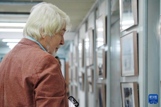 8月28日,在俄罗斯圣彼得堡,一名男子参观纪念中国人民抗日战争暨世界反法西斯战争胜利80周年图片展。新华社记者 周天翮 摄